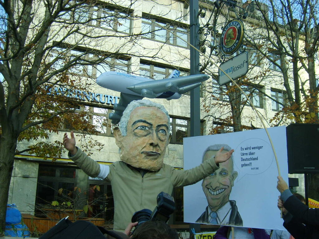 Bunter Protest von „Aufgemuckt“. Die Bürgerinitiativen machen lautstark deutlich, dass die Startbahn für sie sehr wohl ein Thema ist, doch der Ministerpräsident geht mit keiner Silbe darauf ein.