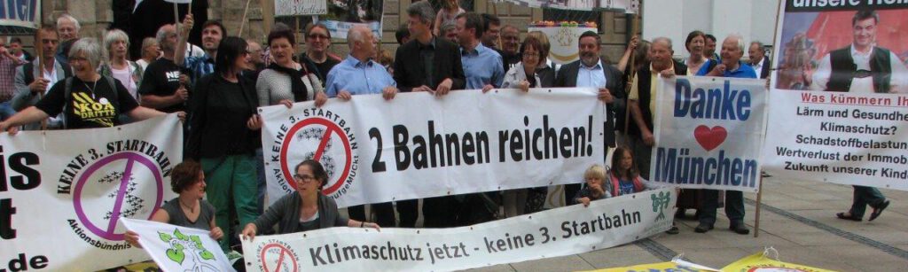 2012: In einem gewaltigen Kraftakt wurde, beginnend mit der letzten großen Demo auf dem Münchner Marienplatz im Herbst 2011, ein Bürgerbegehren gegen den Bau in der Stadt München eingeleitet. Der Anteilseigner der FMG sollte hiermit gezwungen werden, gegen den Bau zu stimmen, was bei der erforderlichen Einstimmigkeit den Bau unmöglich macht. In Zusammenarbeit mit dem neu gegründeten Bündnis in München gelang es dieses Ziel am 17. Juni zu erreichen! Damit ist ein wichtiger Etappensieg gelungen.